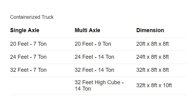 | Full Truck Load | Capacity 9 MT | Size 18x7x7 |