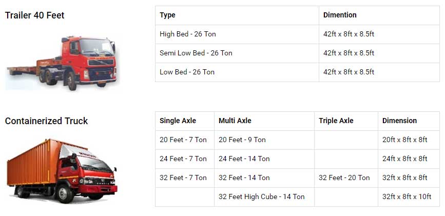 Range of vehicles available are : Canter, Full Body, Half Body, Closed Body Containers and Platforms ranging from 14FT, 17Ft, 20Ft,32 FT to 40Ft which can carry loads from 1 to 40 Tonnes.